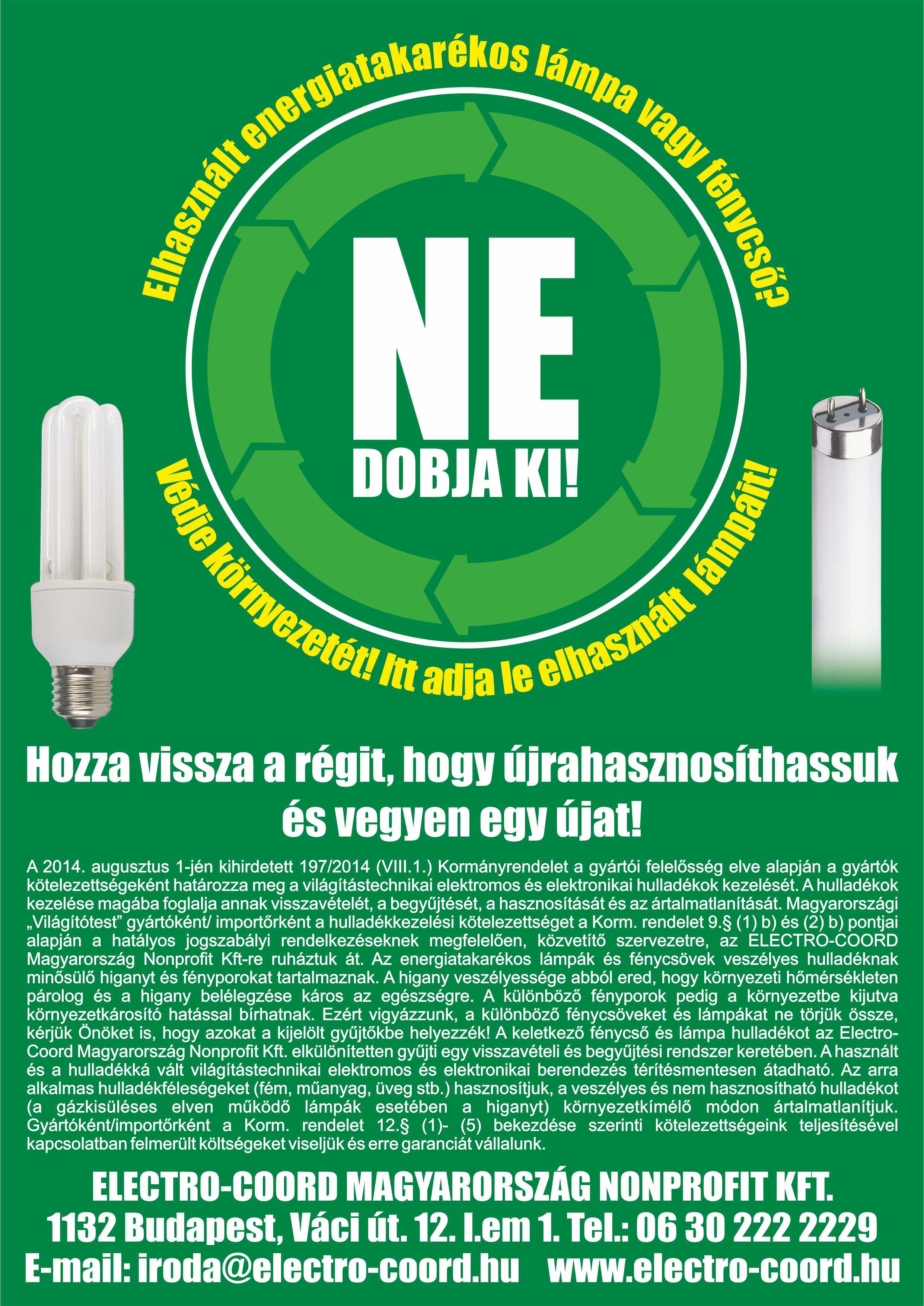 A 2014. augusztus 1-én kihirdetett 197/2014 (VIII.1.) Kormányrendelet a gyártói felelősség elve alapján a gyártók kötelezettségeként határozza meg a világítástechnikai elektromos és elektronikai hulladékok kezelését. A hulladékok kezelése magába foglalja annak visszavételét, a begyűjtését, a hasznosítását és az ártalmatlanítását. A LED-DISZKONT Kft. magyarországi ,,Világítótest" gyártóként/importőrként a hulladékkezelési kötelezettségünket a Korm. rendelet 9.§ (1) b) és (2) b) pontjai alapján a hatályos jogszabályi rendelkezéseknek megfelelően, közvetítő szervezetre, az ELECTRO-COORD Magyarország Nonprofit Kft-re ruháztuk át. Az általunk forgalmazott LED lámpák, lámpatestek és tartozékaik veszélyes hulladéknak minősülő anyagokat nem tartalmaznak. Az újrahasznosítható anyagok tekintetében az általunk forgalmazott lámpák és lámpatestek fő alkotórészei a következők: fém, műanyag és üveg. Kérjük Önöket is, hogy a különböző fénycsöveket és lámpákat a kijelölt gyűjtőkbe helyezzék, úgy, hogy azok ne törjenek össze! A keletkező fénycső, lámpa és lámpatest hulladékot az ELECTRO-COORD Magyarország Nonprofit Kft. elkülönítetten gyűjti egy visszavételi és begyűjtési rendszer keretében. A használt és a hulladékká vált világítástechnikai elektromos és elektronikai berendezés térítésmentesen átadható. Az arra alkalmas hulladékféleségeket (fém, műanyag, üveg stb.) hasznosítjuk, a veszélyes és nem hasznosítható hulladékot (a gázkisüléses elven működő lámpák esetében a higanyt) környezetkímélő módon ártalmatlanítjuk. Gyártóként/importőrként a Korm. rendelet 12.§ (1)- (5) bekezdése szerinti kötelezettségeink teljesítésével kapcsolatban felmerült költségeket viseljük és erre garanciát vállalunk.