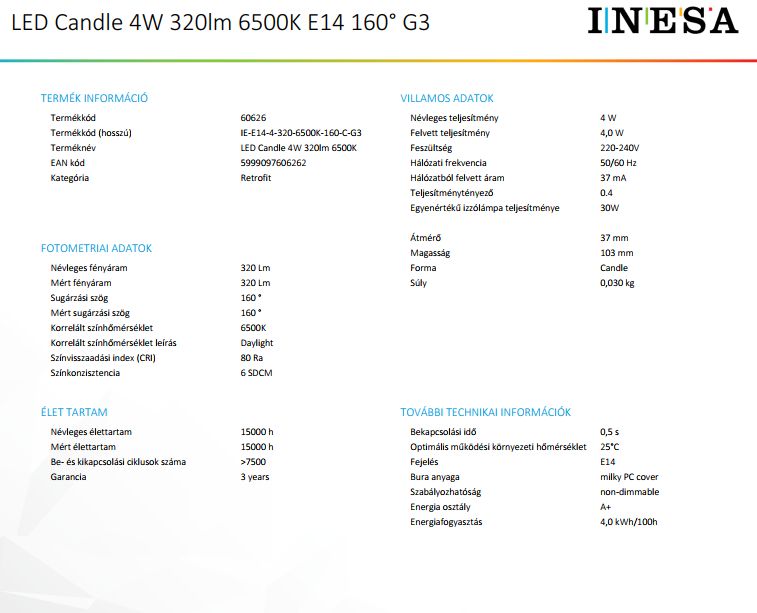 Inesa Led gyertya égő 4W, 40W izzó helyett. 320 Lumen, 6500K, hideg fény, E14 foglalat. Nem vibrál a fénye!