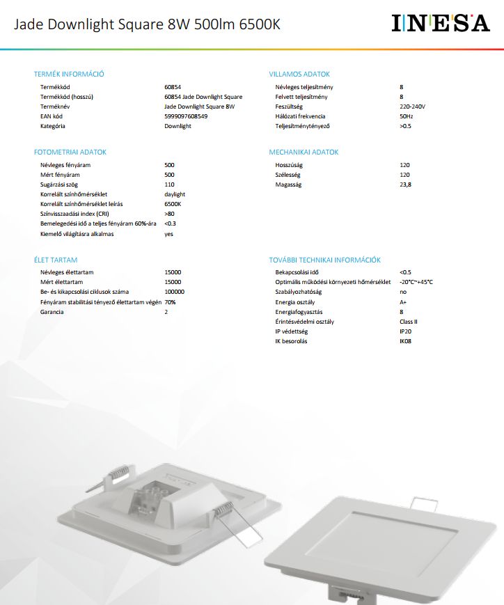 Inesa Led panel 8W, driverrel, négyzet, 500 lumen, 6500 kelvin, hideg fehér. Beépíthető 4,4 col. Nem vibrál!
