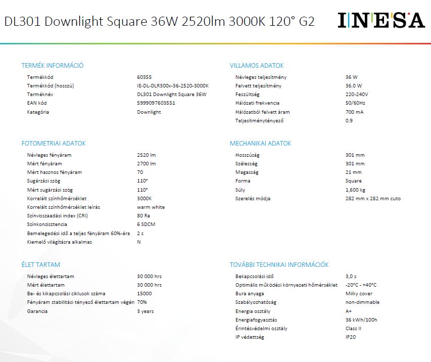 Inesa Led panel 36W, 2520 lumen, Beépíthető világítás, 3000K meleg fehér. Nem vibrál! Nagy Led panel helyére fővilágításnak is alkalmas!