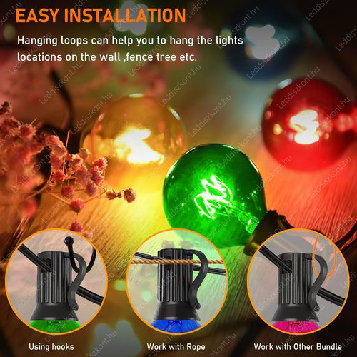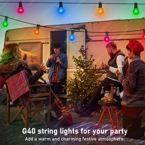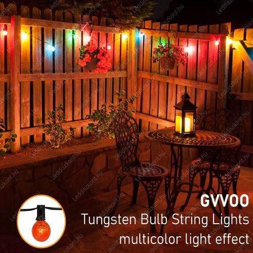 Kerti LED fényfüzér toldható, vízálló, IP44, 18 méter, 25db színes körte Leddel. Kiválóan alkalmas éttermek, kerthelyiségek, teraszok, bulik hangulatosabbá tételéhez! Maximum 4db toldható egybe. 230V, 13W fogyasztás, IP44, tápvezeték 5 méter, teljes hossz 18 méter, 25db 40mm fejátmérőjű, E12 foglalat színes égők. Az égők cserélhetőek, ajándék 1db tartalék égő!
