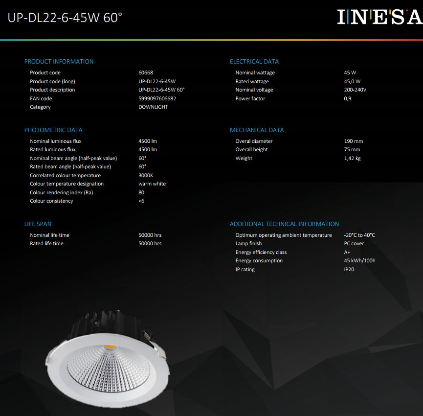Inesa Led beépíthető lámpa, Led mélysugárzó, spot lámpa, 60°-os szórásszögű. Extra fényerő 45W, 4500 lumen, 3000 kelvin meleg fehér. kiválóan alkalmas üzlet, iroda, nagy terek megvilágítására! Gipszkartonba, kazettás álmennyezetbe, bútorba ideális, csak vágja ki a lyukat és máris berakható! Led panel helyett is! Akár 50.000 óra élettartam! Átmérő 190mm, magasság 75mm, lyukméret 160mm.